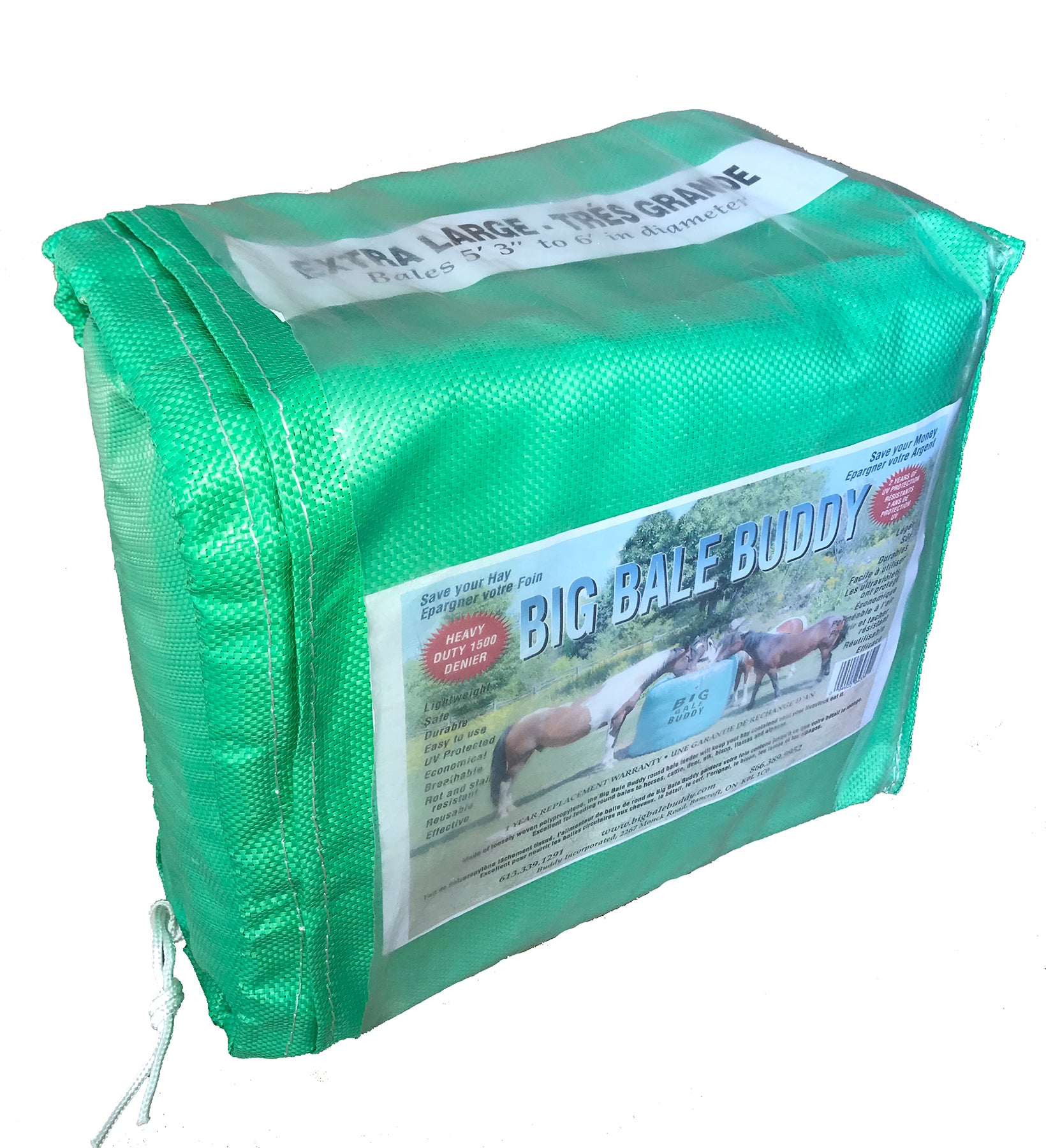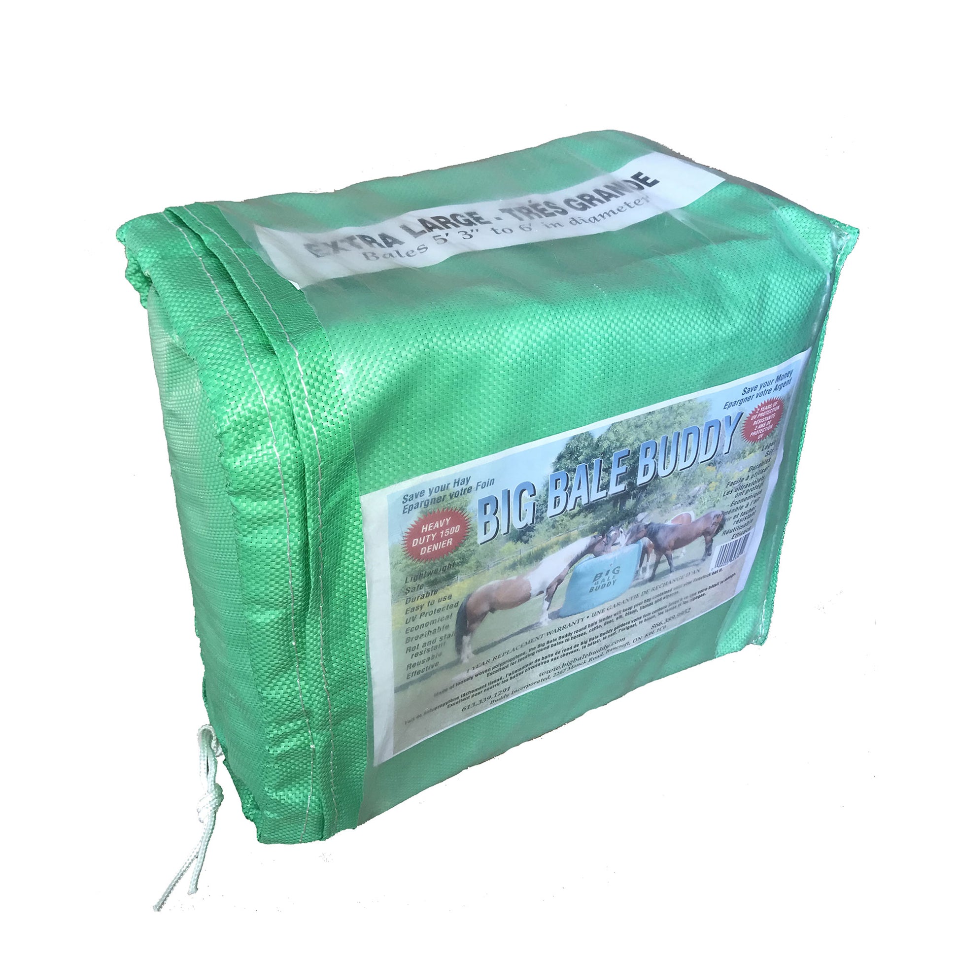 Extra Large Big Bale Buddy for feeding round bales from 5 feet 3 inches up to 6 feet in diameter. Made of heavy duty, UV protected open weave polypropylene, it is long lasting, strong and lightweight. Safe and effective for all livestock. Helps to protect hay in windy and muddy conditions and minimizes waste, so that your round bale lasts 1/3 longer. Can be turned on its side to help keep the bale dry in rainy conditions. Pays for itself many times over in saved hay. One year warranty.
